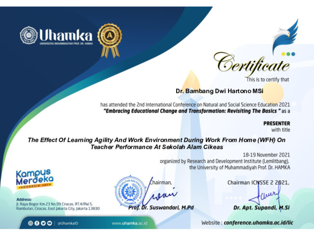 Bambang, Dwi Hartono sertifikat Presenter The 2nd Internasinal Conference INSSE 2021. Documentation. MM UHAMKA. (Submitted)
