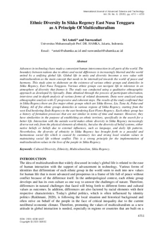 Sri Astuti, Astuti dan Suswandari, Suswandari Ethnic Diversity In Sikka Regency East Nusa Tenggara as A Principle Of Multiculturalism. International Journal of Advanced Science and Technology.