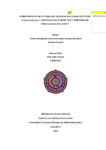 Triyani, Wiji Adha dan YATI, KORI dan Amalia, Anisa (2019) PERBANDINGAN SIFAT FISIK GEL EKSTRAK DAUN BAKUNG PUTIH (Crinum asiaticum L.) MENGGUNAKAN HPMC DAN CARBOMER 940 SEBAGAI GELLING AGENT. Bachelor thesis, Universitas Muhammadiyah Prof. DR. HAMKA.