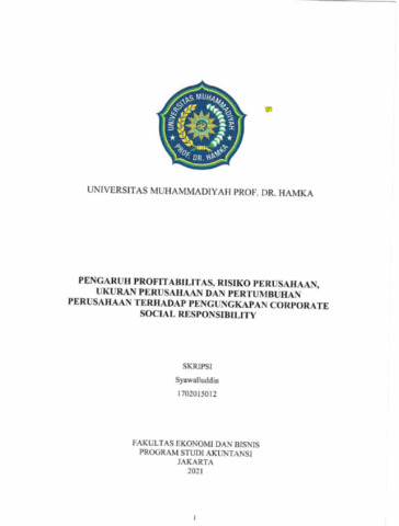 Syawalluddin, Syawalluddin (2021) Pengaruh Profitabilitas, Risiko Perusahaan, Ukuran Perusahaan Dan Pertumbuhan Perusahaan Terhadap Pengungkapan Corporate Social Responsibility. Bachelor thesis, Universitas Muhammadiyah Prof. DR. HAMKA.