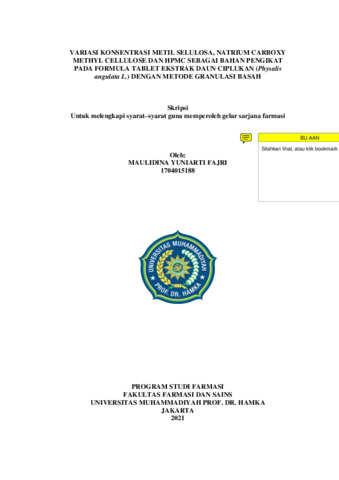 Fajri, Maulidina Yuniarti dan Prisiska, Fahjar dan Gusmayadi, Inding (2021) VARIASI KONSENTRASI METIL SELULOSA, NATRIUM CARBOXY METHYL CELLULOSE DAN HPMC SEBAGAI BAHAN PENGIKAT PADA FORMULA TABLET EKSTRAK DAUN CIPLUKAN (Physalis angulata L.) DENGAN METODE GRANULASI BASAH. Bachelor thesis, Universitas Muhammadiyah Prof. DR. HAMKA.