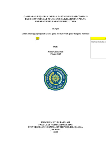 Gusnawati, Asma dan Wulandari, Nora dan Fauziyah, Siti (2022) GAMBARAN KEJADIAN IKUTAN PASCA IMUNISASI COVID-19 PADA MASYARAKAT PULAU SABIRA KELURAHAN PULAU HARAPAN KEPULAUAN SERIBU UTARA. Bachelor thesis, Universitas Muhammadiyah Prof. DR. HAMKA.