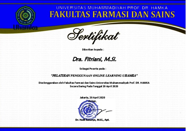 Fitriani, Fitriani Sertifikat Pelatihan Online Learning di UHAMKA. Universitas Muhammadiyah Prof. Dr. Hamka. (Unpublished)