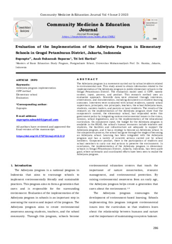 Tri Isti Hartini, TIH Artikel 6_2023 Evaluation of the Implementation of the Adiwiyata Program in Elementary Schools in Grogol Petamburan District, Jakarta, Indonesia. Uhamka. (Unpublished)