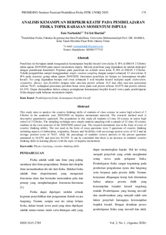 Tri Isti Hartini, TIH Artikel 9_2020 Isti ANALISIS KEMAMPUAN BERPIKIR KEATIF PADA PEMBELAJARAN FISIKA TOPIK BAHASAN MOMENTUM IMPULS. Uhamka. (Unpublished)