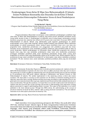 Tri Isti Hartini, TIH Artikel PkM 2_2022 Isti Pendampingan Siswa Kelas XI Mipa Sma Muhammadiyah 23 Jakarta Dalam Praktikum Kinematika dan Dinamika Gerak Kelas X Untuk Menstimulasi Keterampilan Psikomotor Siswa di Awal Pembelajaran Tatap Muka. Uhamka. (Unpublished)
