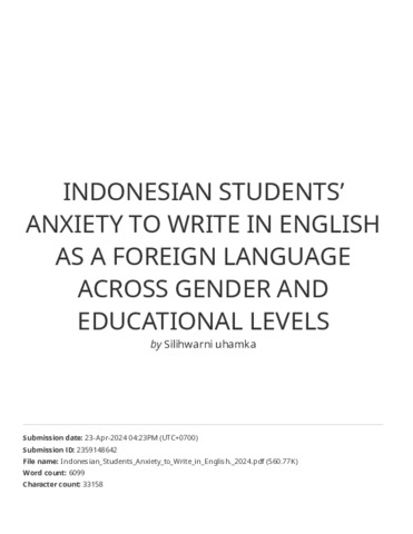 INDONESIAN STUDENTS’ ANXIETY TO WRITE IN ENGLISH AS A FOREIGN LANGUAGE ACROSS GENDER AND EDUCATIONAL LEVELS (3).pdf - Other Download (2MB) | Preview |