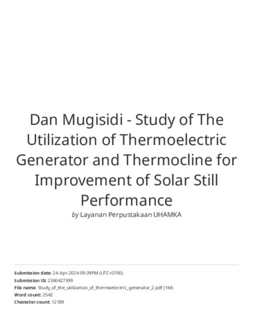 Dan Mugisidi - Study of The Utilization of Thermoelectric Generator and Thermocline for Improvement of Solar Still Performance (1).pdf Download (1MB) | Preview |