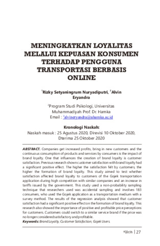 Nuryadiputri, Rizky Setyaningrum dan Eryandra, Alvin (2021) Meningkatkan loyalitas melalui kepuasan konsumen terhadap pengguna transportasi berbasis online. JURNAL SPIRITS: Khasanah Psikologi Nusantara, 11 (1). pp. 27-50. ISSN 2087-7641