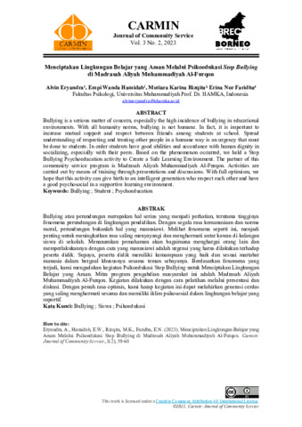 Eryandra, Alvin dan Wanda Hamidah, Empi dan Karina Rizqita, Mutiara dan Nur Faridha, Erina (2023) Menciptakan Lingkungan Belajar yang Aman Melalui Psikoedukasi Stop Bullying di Madrasah Aliyah Muhammadiyah Al-Furqon. Carmin: Journal of Community Service, 3 (2). pp. 59-68. ISSN 2809-8242