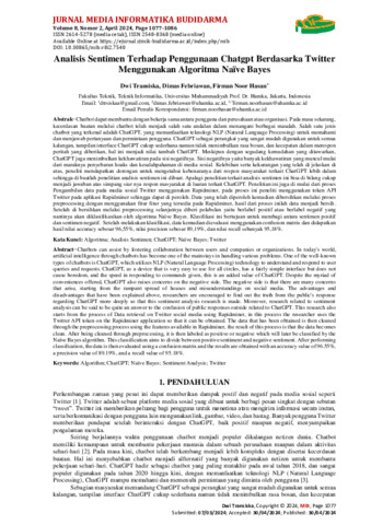 Chatbots can assist by fostering collaboration between users and companies or organizations. In today's world, artificial intelligence through chatbots has become one of the mainstays in handling various problems. One of the well-known types of chatbots is ChatGPT, which utilizes NLP (Natural Language Processing) technology to understand and respond to user queries and requests. ChatGPT, as a device that is very easy to use for all circles, has a fairly simple interface but does not cause boredom, and the speed in responding to commands given, this is an added value of ChatGPT. Despite the myriad of conveniences offered, ChatGPT also raises concerns on the negative side. The negative side is that there are many concerns that arise, starting from the rampant spread of hoaxes and misunderstandings on social media. The advantages and disadvantages that have been explained above, researchers are encouraged to find out the truth from the public's response regarding ChatGPT more deeply so that this sentiment analysis research is made. Moreover, research related to sentiment analysis can be said to be quite an answer to the confusion of public responses outside related to ChatGPT. This research also starts from the process of Data retrieval on Twitter social media using Rapidminer, in this process the researcher uses the Twitter API token on the Rapidminer application so that it can be obtained. The data that has been obtained is then cleaned through the preprocessing process using the features available in Rapidminer, the result of this process is that the data becomes clean. After being cleaned through preprocessing, it is then labeled as positive or negative which will later be classified by the Naïve Bayes algorithm. This classification aims to divide between positive sentiment and negative sentiment. After performing classification, the data is then evaluated using a confusion matrix and the results are obtained with an accuracy value of 96.55%, a precision value of 89.19%, and a recall value of 95.18%.