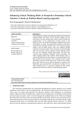 IRDALISA, IRDALISA Enhancing Critical Thinking Skills of Prospective Elementary School Teachers: A Study on Problem-Based Learning Approach. Al-Ishlah: Jurnal Pendidikan. ISSN 2087-9490