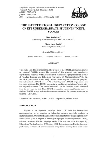 Kaniadewi, Nita dan Ismu Asyifa, Dinda THE EFFECT OF TOEFL PREPARATION COURSE ON EFL UNDERGRADUATE STUDENTS’ TOEFL. THE EFFECT OF TOEFL PREPARATION COURSE ON EFL UNDERGRADUATE STUDENTS’ TOEFL.