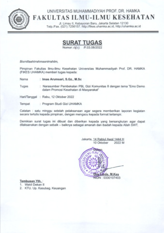 Arumsari, Imas Narasumber pembekalan PBL Gizi Komunitas II. Universitas Muhammadiyah Prof. Dr. Hamka. (Unpublished)
