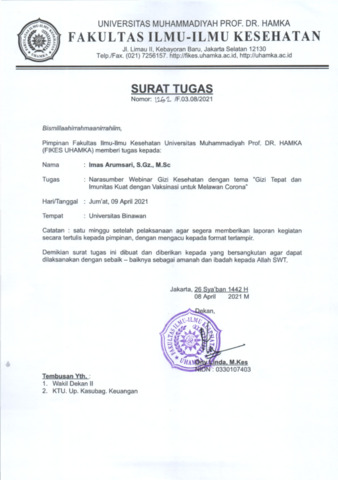 Arumsari, Imas Narasumber webinar gizi Kesehatan. Universitas Muhammadiyah Prof. Dr. Hamka. (Unpublished)