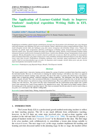 Arifin, Syaadiah sinta 2 2021-2022. The Application of Learner-Guided Study to Improve Students’ Analytical exposition Writing Skills in EFL Classroom, 55 (2). pp. 353-361. ISSN E-ISSN: 2549-2608