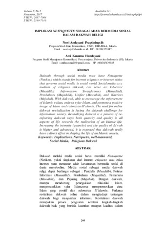 Novi Andayani Praptiningsih, NAP Implikasi Nettiquette Sebagai Adab Bermedia Sosial Dalam Dakwah Religi. Jurnal Pendidikan Islam.