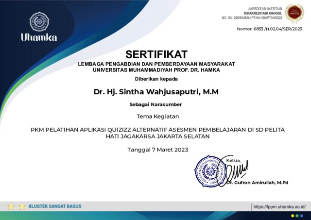Sintha Wahjusaputri, Sintha sertifikat narsum pkm quiziz alternatif asesmen pembelajaran. uhamka.