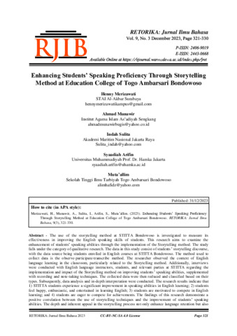 Arifin, Syaadiah (2023) 7. SINTA 3. Enhancing Students’ Speaking Proficiency Through Storytelling Method at Education College of Togo Ambarsari Bondowoso, 9 (3). pp. 321-330. ISSN P-ISSN 2406-9019