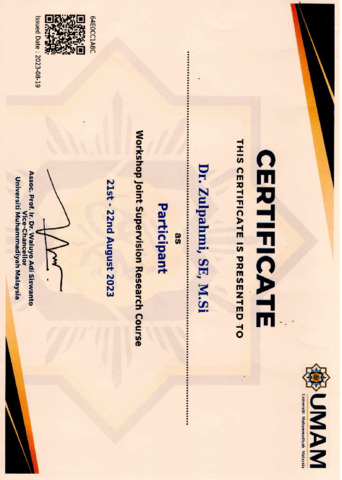 Zulpahmi, Zulpahmi Sertifikat Workshop Joint Supervision Research Course. FEB UHAMKA. (Unpublished)