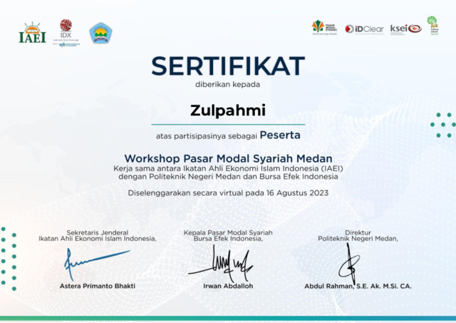 Zulpahmi, Zulpahmi Sertifikat Workshop Pasar Modal Syariah Medan. FEB UHAMKA. (Unpublished)