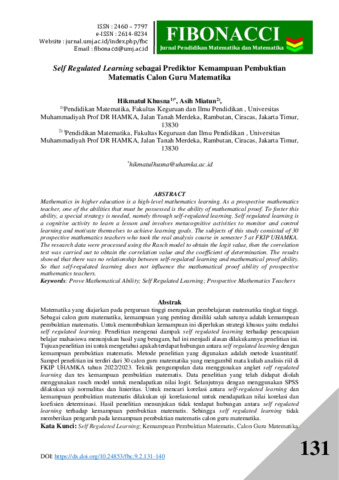 Khusna, Hikmatul Self Regulated Learningsebagai Prediktor Kemampuan Pembuktian Matematis Calon Guru Matematika. Fibonacci: Jurnal Pendidikan Matematika dan Matematika.