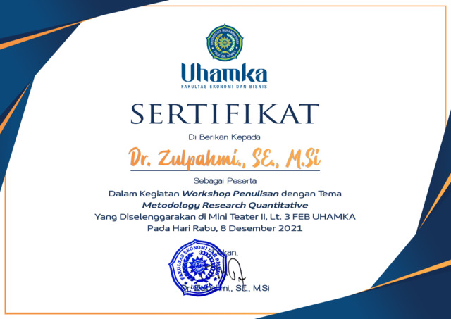 Zulpahmi, Zulpahmi Sertifikat Workshop Penulisan dengan Tema Metodology Research Quantitative. FEB UHAMKA. (Unpublished)