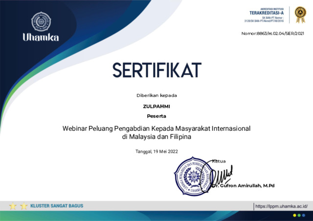 Zulpahmi, Zulpahmi Sertifikat Webinar Peluang Pengabdian Kepada Masyarakat Internasional di Malaysia dan Filipina. FEB UHAMKA. (Unpublished)