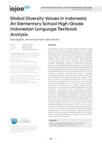 Wini Tarmini, Wini Global Diversity Values in Indonesia: An Elementary School High-Grade Indonesian Language Textbook Analysis. INTERNATIONAL ELECTRONIC JOURNAL OF ELEMENTARY EDUCATION.