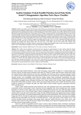 The conflict between Palestine and Israel has been ongoing for approximately 76 years, during which the Zionist movement has attempted to establish a Jewish homeland in Palestinian territory. In October 2023, news about this conflict resurfaced and has continued up until June 2024. This issue has drawn global attention, including from the Indonesian public. On the social media platform X, numerous comments and posts both negative and positive regarding the Palestine-Israel conflict have appeared as a result of the ongoing challenges faced by Palestine. This study aims to analyze the sentiment expressed on the social media platform X regarding the Palestine-Israel conflict. The data collected focuses solely on comments and posts from Indonesia, totaling 1,715 entries. The study employs the Naïve Bayes Classifier algorithm, with an 80% to 20% ratio of training data to test data, following a pre-processing phase. The results of this study indicate an accuracy of 94%, precision of 91%, recall of 100%, and an F1-Score of 95%. The analysis reveals a positive sentiment, suggesting that the Indonesian public's response on the social media platform X predominantly shows positive support towards Palestine