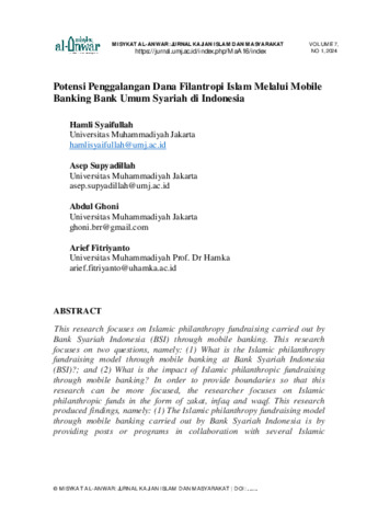 arief fitriyanto, arief fitriyanto (2024) Potensi Penggalangan Dana Filantropi Islam Melalui Mobile Banking Bank Umum Syariah di Indonesia. Misykat Al-Anwar, 7 (1). ISSN 2715-6931