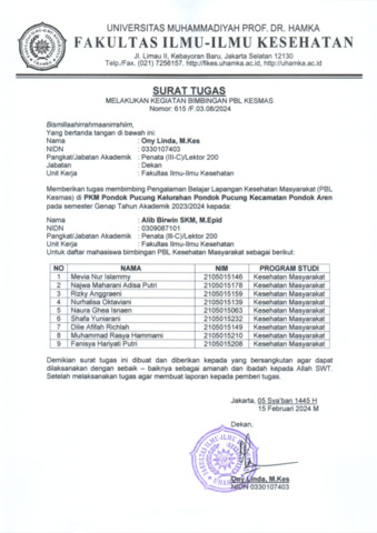 Birwin, Alib SURAT TUGAS PEMBIMBING PBL KESMAS. FIKES UHAMKA. (Unpublished)