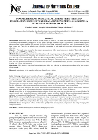 Nursyifa Rahma, Maulida PENGARUH EDUKASI ANEMIA MELALUI MEDIA VIDEO TERHADAP PENGETAHUAN, SIKAP, SERTA KEBERAGAMAN KONSUMSI MAKANAN REMAJA PUTRI DI SMP NEGERI 86 JAKARTA. PENGARUH EDUKASI ANEMIA MELALUI MEDIA VIDEO TERHADAP PENGETAHUAN, SIKAP, SERTA KEBERAGAMAN KONSUMSI MAKANAN REMAJA PUTRI DI SMP NEGERI 86 JAKARTA, 12 (2). pp. 127-138. ISSN 2337-6236