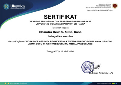 Chandra Dewi S., CDS Sertifikat narasumber dan SPK PkM Pandeglang Mei 2024. Universitas Muhammadiyah Prof. Dr. Hamka. (Unpublished)