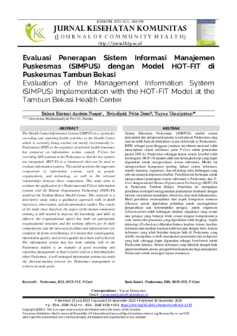 Umniyatun, Yuyun (2023) Evaluasi Penerapan Sistem Informasi Manajemen Puskesmas (SIMPUS) dengan Model HOT-FIT di Puskesmas Tambun Bekasi. Jurnal Kesehatan Komunitas, 9 (3). pp. 588-598. ISSN 2088-7612