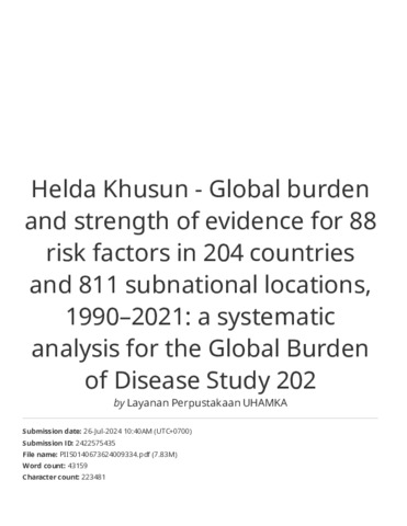 Helda Khusun - Global burden and strength of evidence for 88 risk factors in 204 countries and 811 subnational locations, 1990–2021_ a systematic analysis for the Global Burden of Disease Study 202.pdf Download (13MB) | Preview |