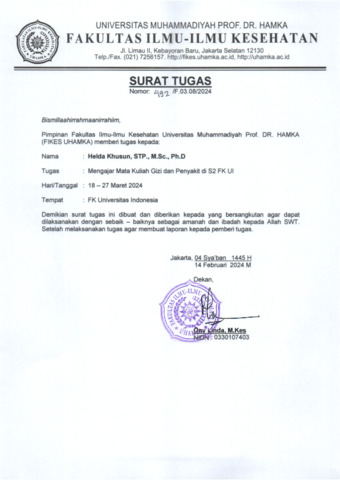 Khusun, Helda Mengajar mata kuliah gizi dan penyakit di S2 FK UI. Program Studi Gizi, Universitas Muhammadiyah Prof. Dr. Hamka. (Submitted)