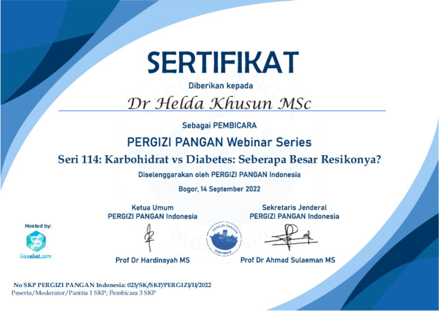Khusun, Helda Narasumber kegiatan PERGIZI PANGAN Webinar Series yang ke-114 dengan tema “Karbohidrat vs Diabetes: Seberapa Besar Resikonya?”. Program Studi Gizi, Universitas Muhammadiyah Prof. Dr. Hamka. (Submitted)