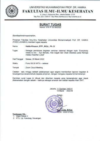 Khusun, Helda Pembicara seminar nasional dengan topik “ Everybody needs to Act - Ayo Bersatu, Kita Cegah dan Obati Obesitas pada Remaja melalui Kearifan Lokal”. Program Studi Gizi, Universitas Muhammadiyah Prof. Dr. Hamka. (Submitted)