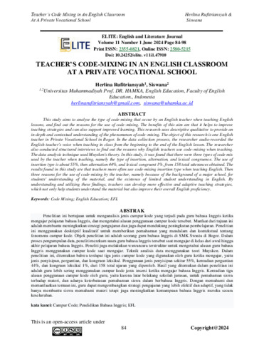 Siswana, Siswana (2024) TEACHER’S CODE-MIXING IN AN ENGLISH CLASSROOM AT A PRIVATE VOCATIONAL SCHOOL. TEACHER’S CODE-MIXING IN AN ENGLISH CLASSROOM AT A PRIVATE VOCATIONAL SCHOOL, 11 (1). pp. 84-98. ISSN 2580-5215