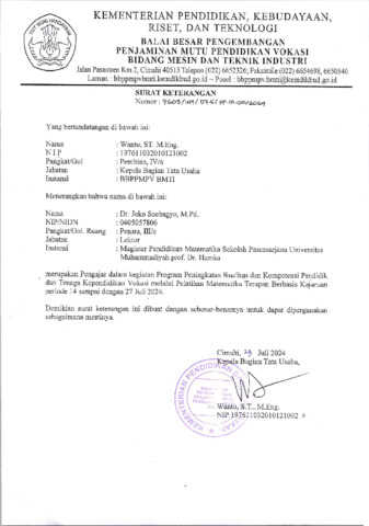 Soebagyo, Joko (2024) Surat Keterangan Pengajar BMTI. Universitas Muhammadiyah Prof. Dr. Hamka. (Unpublished)