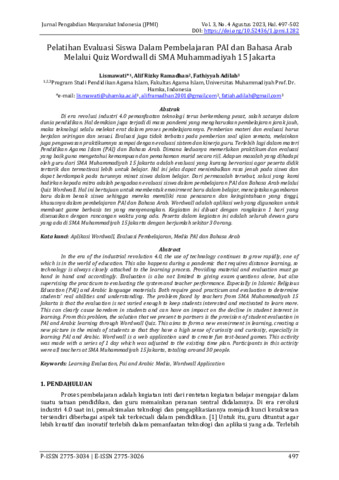 lismawati, lismawati (2023) Pelatihan Evaluasi Siswa Dalam Pembelajaran PAI dan Bahasa Arab Melalui Quiz Wordwall di SMAMuhammadiyah 15 Jakarta. Jurnal Pengabdian Masyarakat Indonesia, 3 (4). (Unpublished)