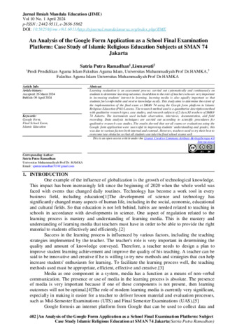 lismawati, lismawati (2024) An Analysis of the Google Form Application as a School Final Examination Platform: Case Study of Islamic Religious Education Subjects at SMAN 74 Jakarta. Jurnal Ilmiah Mandala Education, 10 (2). pp. 402-407. (Unpublished)