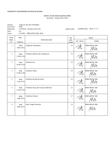 Prima, Mutia Sari BAP, Daftar Hadir, Daftar Nilai Praktikum IPA di SD Kelas 4A. Universitas Muhammadiyah Prof. DR. HAMKA. (Unpublished)