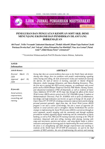 lismawati, lismawati (2024) Peneguhan dan Penguatan Kemampuan Soft Skill Demi Menunjang Ekonomi dan Pendidikan Islam Yang Berkemajuan. EJOIN: Jurnal Pengabdian Masyarakat, 2 (4). pp. 698-704. (Unpublished)