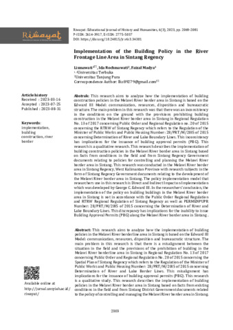 This research aims to analyze how the implementation of building policies in the Melawi River borderline area in Sintang is based on the Edward III Model: communication, resources, disposition and bureaucratic structure. The main problem in this research is that there is a misalignment between the situation in the field and the provisions of the prohibition of building in the Melawi River borderline area in Sintang in Regional Regulation No. 13 of 2017 concerning Public Order and Regional Regulation No. 20 of 2015 concerning the Spatial Plan of Sintang Regency which refers to the Regulation of the Minister of Public Works and Public Housing Number: 28/PRT/M/20I5 of 2015 concerning Determination of River and Lake Border Lines. This misalignment has implications for the issuance of building approval permits (PBG). This research is a qualitative study. This research describes the implementation of building policies in the Melawi River border area in Sintang based on facts from existing conditions in the field and from Sintang District Government documents related to the policy of controlling and managing the Melawi River border area in Sintang. This research was conducted in the Melawi River border area in Sintang Regency, West Kalimantan Province with research subjects in the form of Sintang Regency Government documents related to the development of the Melawi River border area in Sintang . The policy implementation model that researchers use in this study is the Direct and Indirect Impact on Implementation developed by George C. Edward III. The implementation of the building policy in the Melawi River border area in Sintang, in the researcher's conclusion, is not in accordance with the Local Regulation on Public Order and the Local Regulation on Spatial Planning of Sintang Regency and PERMENPUPR Number: 28/PRT/M /20I5 of 2015 concerning Determination of River and Lake Border Lines. This non-conformity has implications for the inability to issue Building Approval Permits (PBG) along the Melawi River boundary line area in Sintang.