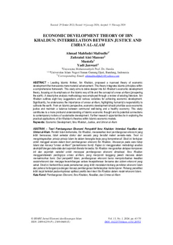 - ECONOMIC DEVELOPMENT THEORY OF IBN KHALDUN: INTERRELATION BETWEEN JUSTICE AND UMRAN AL-ALAM. (deposited 12 Aug 2024 02:24) [Currently Displayed]