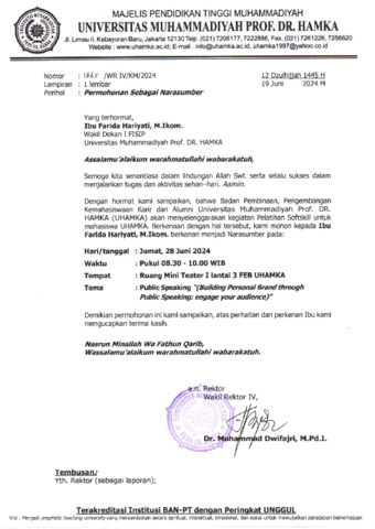 Farida, Hariyati Dokumen Narasumber Pelatihan Soft Skill Mahasiswa UHAMKA "Public Speaking". universitas muhammadiyah prof. dr. hamka. (Unpublished)