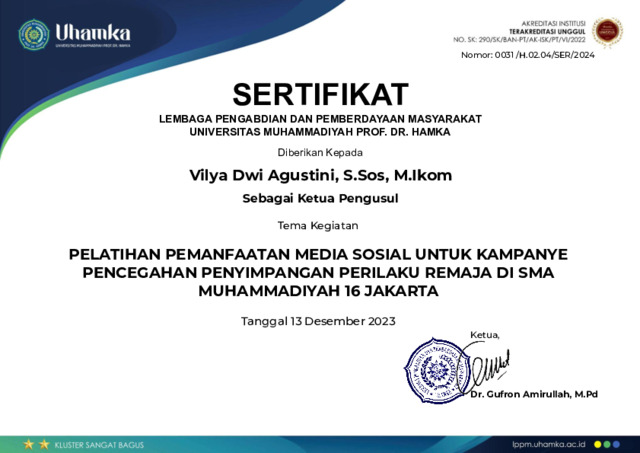 agustini, vilya dwi SERTIFIKAT PENGABDIAN MASYARAKAT GENAP 2024. UNIVERSITAS MUHAMMADIYAH PROF.DR.HAMKA. (Unpublished)