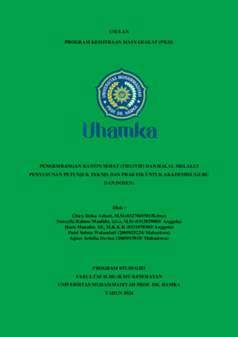 Chica Riska Ashari, M.Si, Ashari dan Nursyifa Rahma Maulida, S.Gz, M.Gizi, Maulida dan Haris Muzakir, SE, M.K.K.K, Muzakir (2024) USULAN PROGRAM KEMITRAAN MASYARAKAT (PKM) PENGEMBANGAN KANTIN SEHAT (THAYYIB) DAN HALAL MELALUI PENYUSUNAN PETUNJUK TEKNIS DAN PRAKTIK UNTUK AKADEMISI (GURU DAN DOSEN). UHAMKA. (Unpublished)